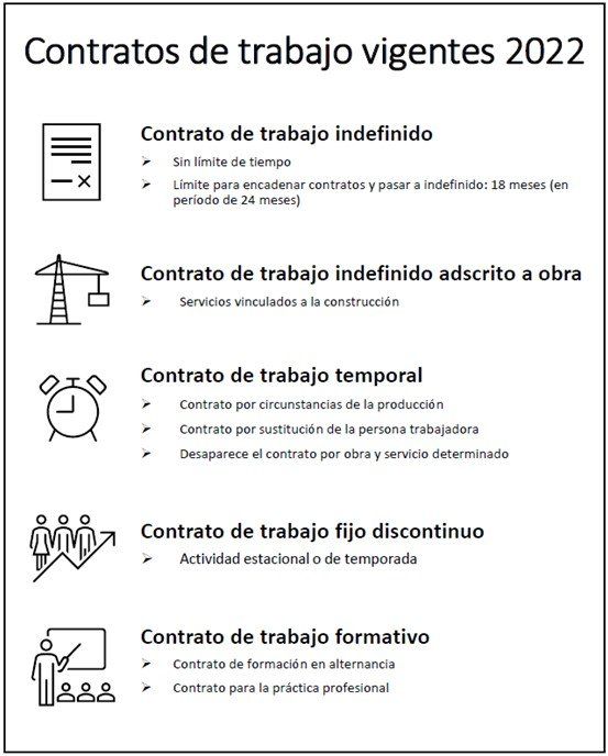 Como resultado del Real Decreto-ley 32/2021 de 28 de diciembre, de medidas urgentes para la reforma laboral, la garantía de la estabilidad en el empleo y la transformación del mercado de trabajo los tipos de contrato de trabajo en España han sido objeto de importantes modificaciones. Estas son las novedades más significativas para este año 2022. 1. Contrato de trabajo indefinido El contrato fijo indefinido se establece sin límite de tiempo. Dentro del mismo encontramos varias tipologías como el contrato para personas con discapacidad, el de alta dirección o el de trabajadores en situación de exclusión social por empresas de inserción, entre otros. La reforma laboral de 2022 también introduce aspectos relevantes en la concreción del contrato laboral indefinido, como son el periodo establecido para encadenar contratos y pasar a ser indefinido, que se limita a 18 meses (en 24 meses). La normativa anterior establecía un límite mucho más amplio, de 24 meses en un marco de 30. 2. Contrato de trabajo indefinido adscrito a obra El contrato está determinado para servicios cuyo fin está vinculado a la construcción. Al concluir la obra, el empresario tiene la obligación de realizar una propuesta a la persona trabajadora para su recolocación, propuesta que se debe materializar en un plazo de 5 días y por escrito. Las causas de la extinción del contrato deberán producirse bajo los siguientes supuestos: • Rechazo de la recolocación por parte de la persona trabajadora. • Falta de cualificación para obra en la provincia. • Inexistencia de obras en la provincia. 3. Contrato de trabajo temporal Hasta la aprobación de la reforma laboral (RD ley 32/2021) existían tres tipos de contratos temporales: • Obra o servicio determinado • Eventual (por circunstancias de la producción) • Interinidad. Con la reforma laboral los contratos de duración determinada quedan de la siguiente manera: a) Contrato por obra y servicio determinado (desaparece) El contrato por obra y servicio determinado desaparece con la nueva regulación y su derogación se materializará a partir del 31 de marzo de 2022 (hasta esa fecha se pueden formalizar con un máximo de 6 meses de duración). b) Contrato por circunstancias de la producción Esta modalidad de contrato de trabajo temporal está establecida para situaciones muy concretas como oscilaciones de la actividad normal de la empresa. La duración no podrá superar los 6 meses ampliables a 12 meses por convenio del sector. La conversión de un contrato temporal a indefinido queda muy claramente definida en la reforma laboral 2022 ya que, en caso de irregularidad, se determinará la condición de indefinido del contrato en cuestión, con la consideración de infracción administrativa y sanciones de 1.000 a 10.000 euros por cada persona contratada irregularmente. c) Contrato por sustitución de persona trabajadora Se guía por los mismos criterios que el contrato de interinidad. La reforma laboral introduce un cambio significativo: la persona sustituta podrá iniciar la prestación de servicios durante 15 días antes de que se produzca la ausencia de la persona sustituida. 4. Contrato de trabajo fijo discontinuo Esta modalidad de contratación es la utilizada como referencia para una actividad estacional o de temporada, así como por empresas de trabajo temporal, contratas y subcontratas. Se contempla para periodos a fecha determinada o indeterminada. Las personas trabajadoras tienen los mismos derechos que en el indefinido, incluyendo la indemnización por despido. 5. Contrato de trabajo formativo Existen dos tipos de contratos formativos: • Contrato de formación en alternancia • Contrato para la práctica profesional a) Contrato de formación en alternancia El objeto de este tipo de contrato es doble: A. Simultanear la actividad laboral retribuida con el correspondiente proceso formativo en el ámbito de la formación profesional, estudios universitarios o catálogo de especialidades en el Sistema Nacional de Empleo. B. El desempeño de una actividad laboral destinada a adquirir una práctica profesional adecuada a los correspondientes niveles de estudios, pudiéndose celebrar sólo con personas en posesión de un título: Universitario, de grado medio o superior, especialista, máster profesional, certificado del sistema de formación profesional, título equivalente de enseñanzas artísticas o deportivas del sistema educativo, que habiliten o capaciten para el ejercicio de la actividad laboral. Las novedades más significativas introducidas son las siguientes: • Duración mínima del contrato: 3 meses, con un máximo de 2 años. • Tiempo de trabajo efectivo: no puede superar el 65% de la jornada máxima durante el primer año y el 85% del segundo. • Podrán celebrarse a tiempo parcial. El tiempo de trabajo efectivo no podrá ser superior al 65% (primer año) o al 85% (segundo año) de la jornada máxima prevista en el convenio colectivo de aplicación en la empresa o, en su defecto, de la jornada máxima legal. • Se eliminan los períodos de prueba. • Se amplía la edad del trabajador contratado (entre 16 y 29 años). • Posibilidad de indemnización: no genera indemnización a su finalización. Se prohíbe expresamente realizar horas complementarias y horas extraordinarias salvo fuerza mayor. b) Contrato para la práctica profesional Contrato dirigido a todas las personas trabajadoras que están en posesión de un título universitario, máster profesional, certificado del sistema de formación profesional o título de grado medio o superior. Las novedades más significativas introducidas son las siguientes: • Duración mínimo 6 meses, máximo 12 meses en la misma o distinta empresa. • El tiempo establecido puede ser completo o parcial. • Período de prueba de 1 mes. • No se pueden realizar horas extras. • Se pueden realizar horas complementarias. • La retribución queda contemplada en el convenio. Si no fuera 